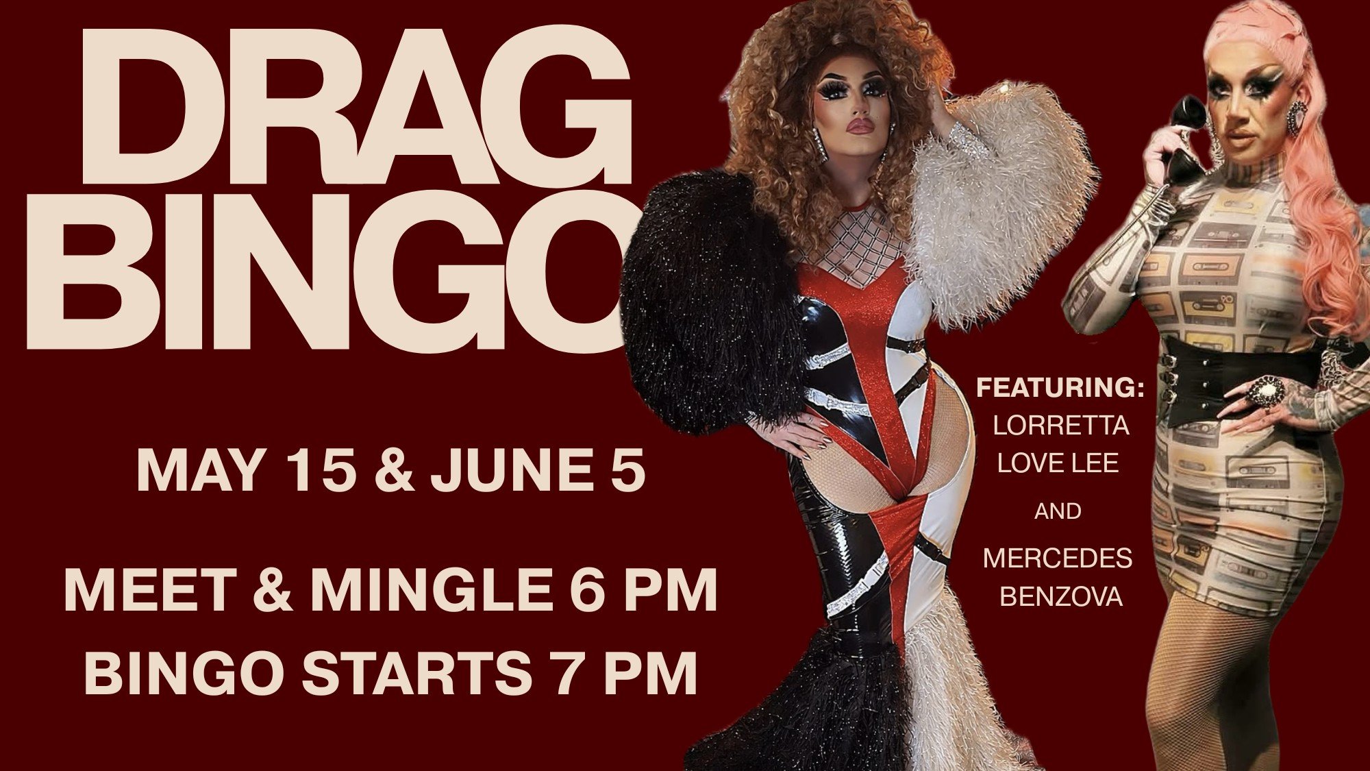 Join us for a fabulous night of bingo, laughs, and larger-than-life entertainment hosted by the stunning Lorretta Love Lee and the incomparable Mercedes Benzova. Whether you're a bingo pro or just here for the show, you're in for an unforgettable evening.